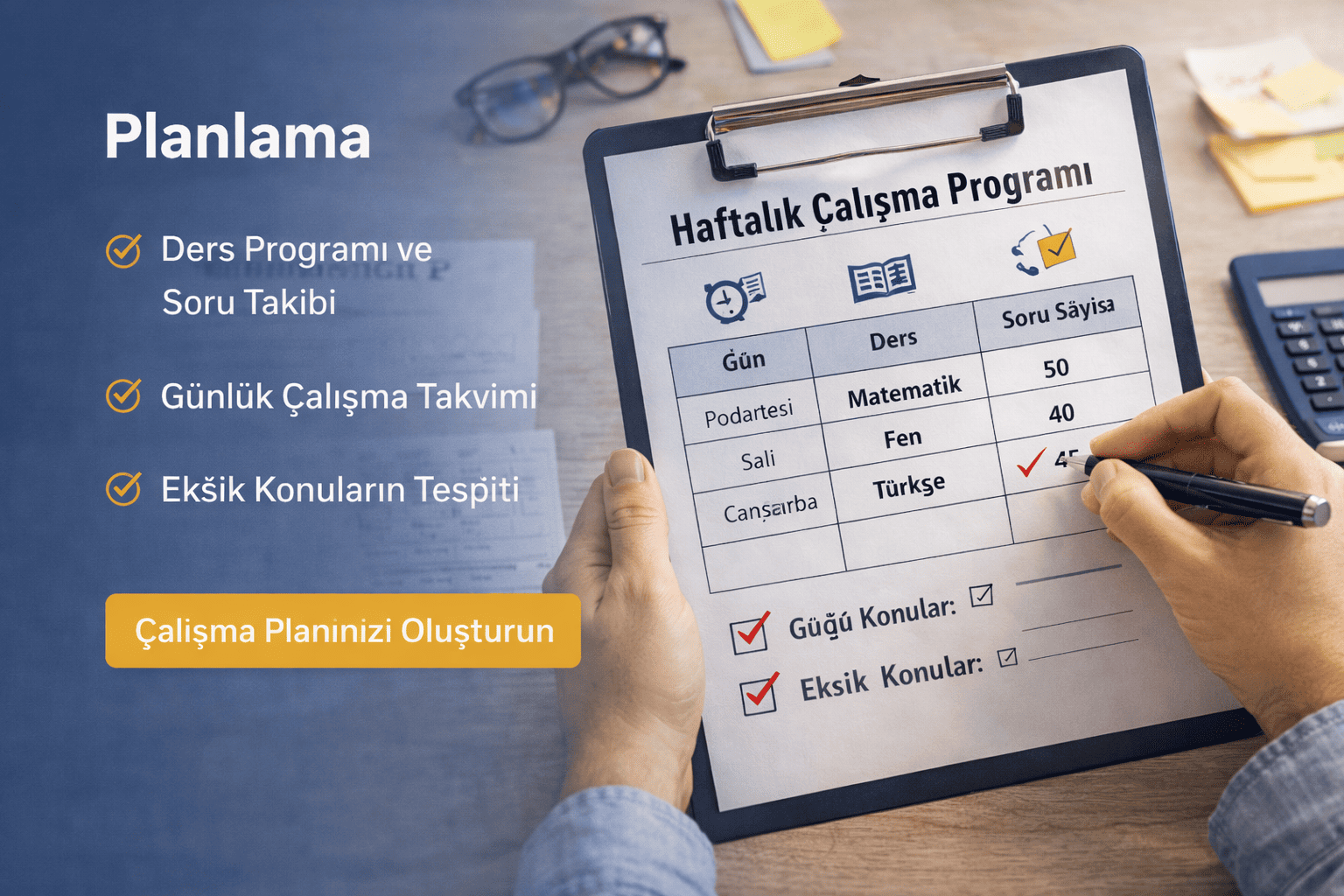 Her öğrenci için derslerine, eksik konularına ve sınav takvimine uygun, verimli ve sürdürülebilir haftalık çalışma programı hazırlanır.